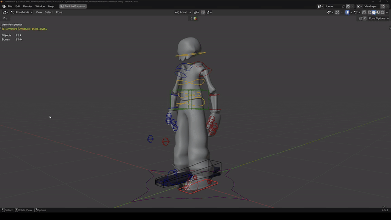 After receiving the 3D model of our player character, I created a custom rig using Blender. The rig utilizes inverse kinematics on the legs to make positioning during animation and natural skating movement more feasible.